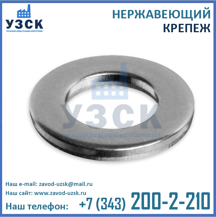 Нержавеющая шайба (плоская деталь с технологическим отверстием по центру) предназначена для обеспечения более прочного винтового или болтового соединения и предотвращения самопроизвольного раскручивания метизов, что особенно актуально на объектах, подвергающихся высоким вибрационным и другим нагрузкам. Для достижения вышеуказанных целей шайба из нержавеющей стали во время установки подкладывается под головку болта/винта, благодаря чему увеличивается прижимная площадь поверхности скрепляемых деталей.